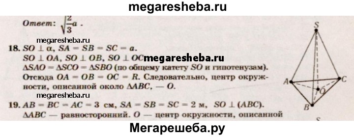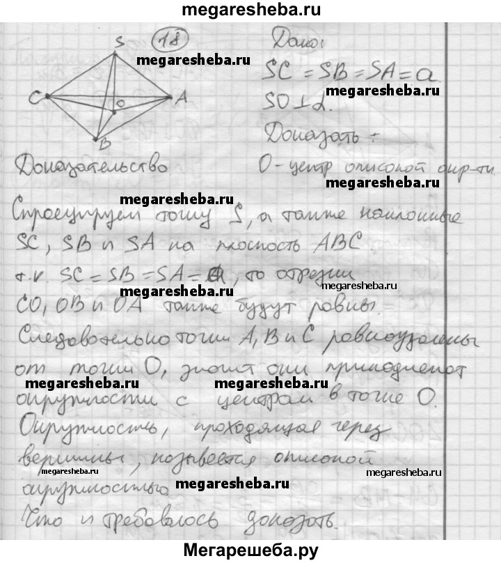 18. Из точки S вне плоскости а проведены к ней три равные наклонные SA, SB, SC и перпендикуляр SO. Докажите, что основание перпендикуляра О является центром окружности, описанной около треугольника ABC.