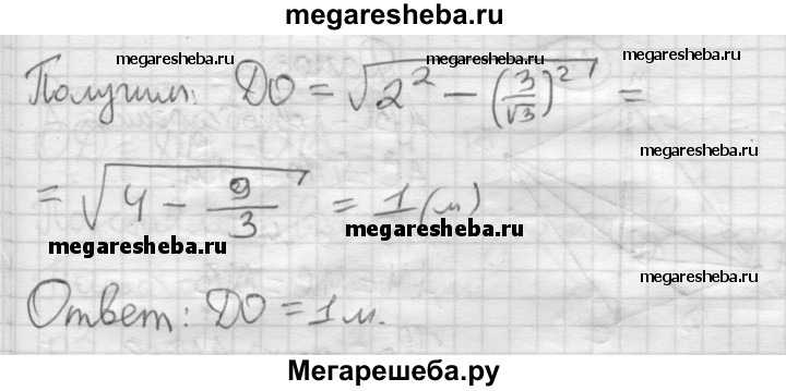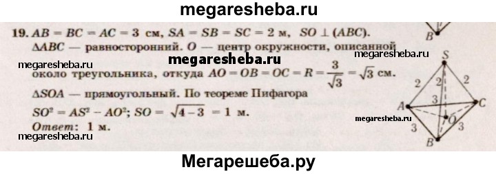19. Стороны равностороннего треугольника равны 3 м. Найдите расстояние до плоскости треугольника от точки, которая находится на расстоянии 2 м от каждой из его вершин.