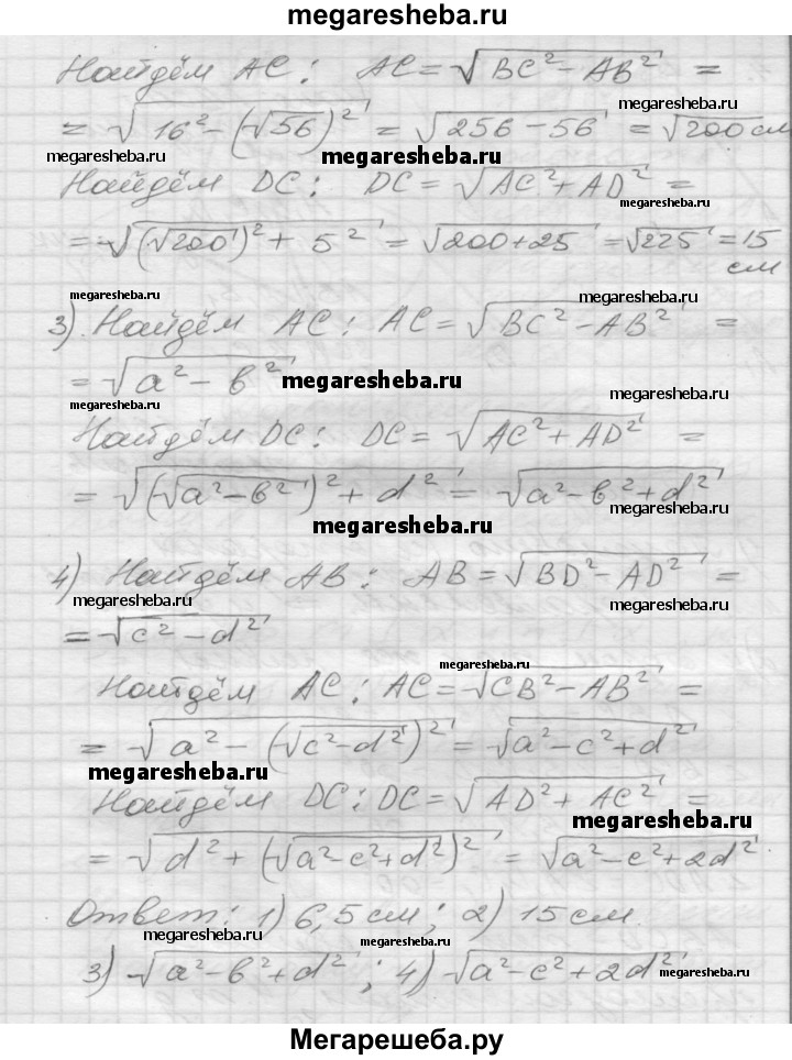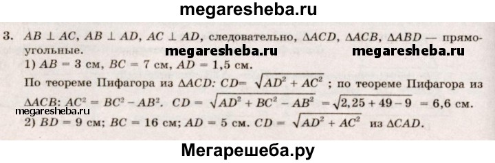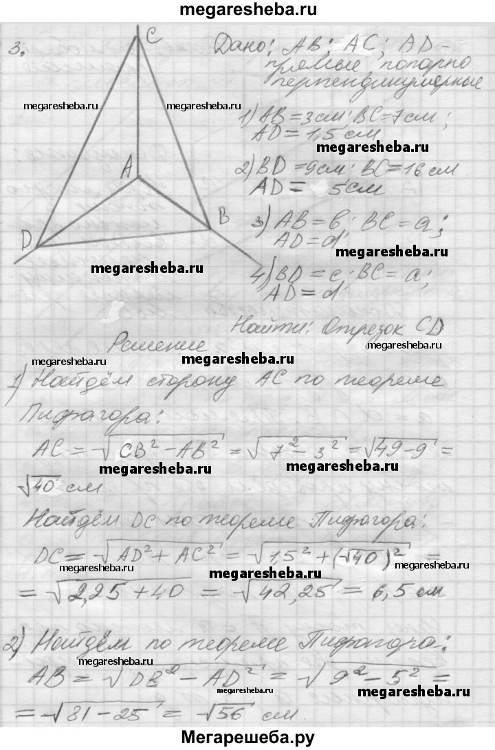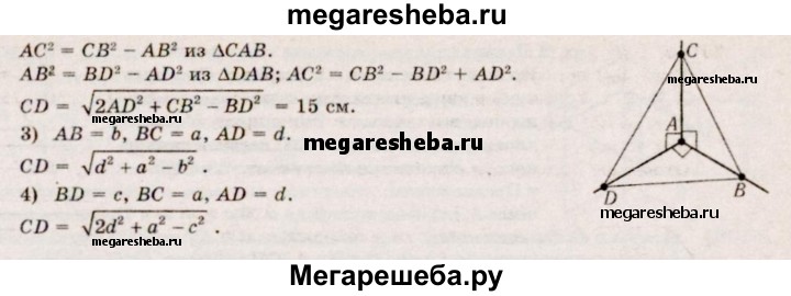 3. Прямые АВ, АС и AD попарно перпендикулярны. Найдите отрезок CD, если: 1) АВ = 3 см, ВС = 7 см, AD = 1,5 см; 2) BD = 9 см, ВС = 16 см, AD = 5 см; 3) АВ = Ь, ВС = a, AD = d; 4) BD = с, ВС = a, AD = d.