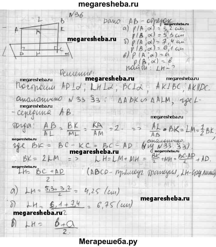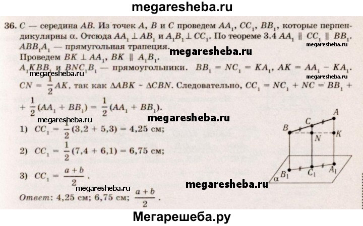 36. Найдите расстояние от середины отрезка АВ до плоскости, не пересекающей этот отрезок, если расстояния от точек А и В до плоскости равны: 1) 3,2 см и 5,3 см; 2) 7,4 см и 6,1 см; 3) а и Ь.