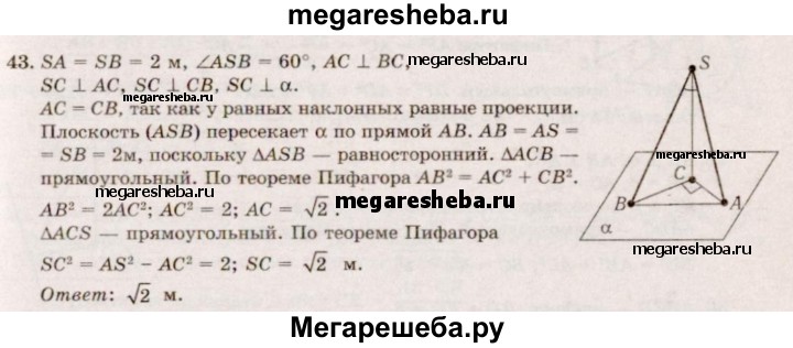 43. Из данной точки к плоскости проведены две равные наклонные длиной 2 м. Найдите расстояние от точки до плоскости, если наклонные образуют угол 60°, а их проекции перпендикулярны.