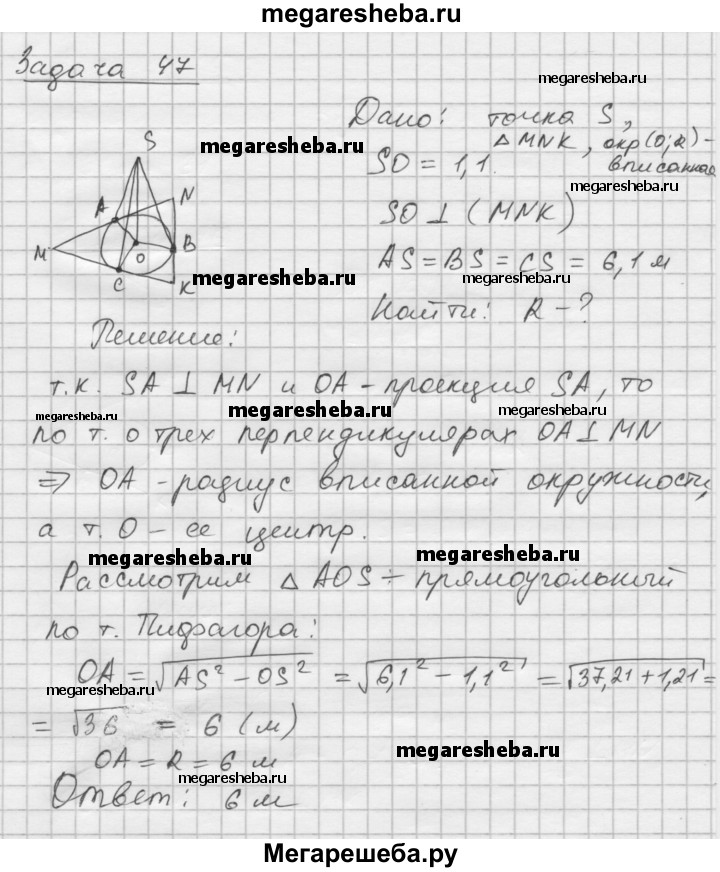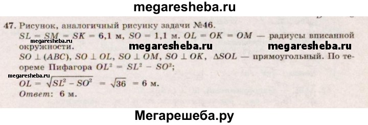 47. Расстояние от данной точки до плоскости треугольника равно 1,1 м, а до каждой из его сторон — 6,1 м. Найдите радиус окружности, вписанной в этот треугольник.