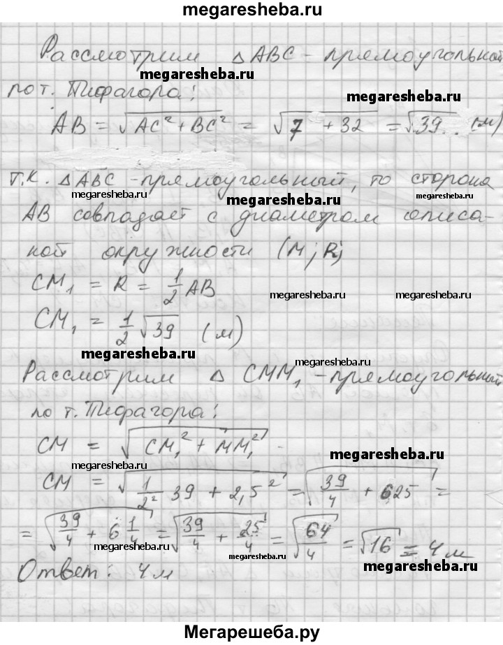 57. Из вершин А и В острых углов прямоугольного треугольника ABC восставлены перпендикуляры АА1 и ВВ1 к плоскости треугольника. Найдите расстояние от вершины С до середины отрезка А1В1, если А1С = 4 м, А1А = 3 м, В1С = 6 м, В1В = 2 м и отрезок А1В1 не пересекает плоскость треугольника.