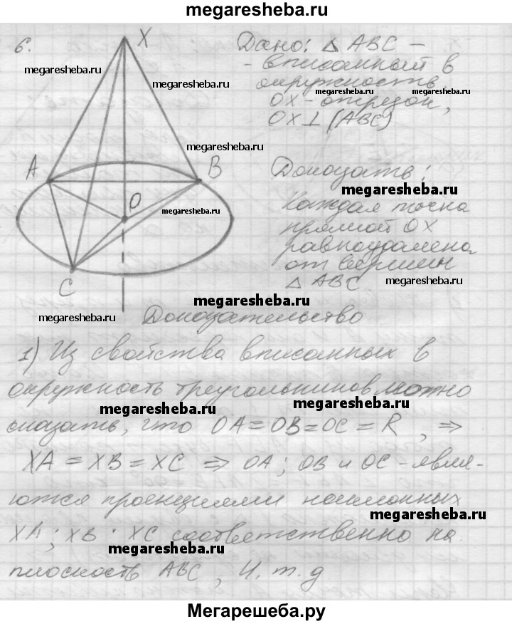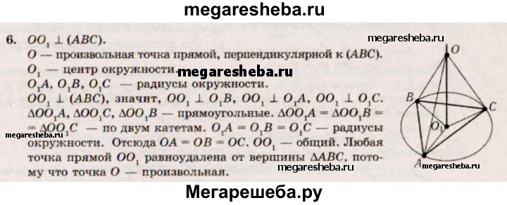 6. Через центр описанной около треугольника окружности проведена прямая, перпендикулярная плоскости треугольника. Докажите, что каждая точка этой прямой равноудалена от вершин треугольника (рис. 62).