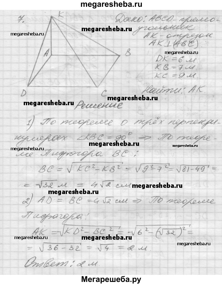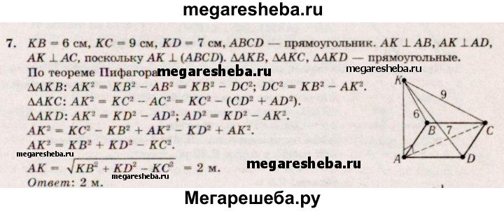 7. Через вершину А прямоугольника ABCD проведена прямая АК, перпендикулярная его плоскости. Расстояния от точки К до других вершин прямоугольника равны 6 м, 7 м и 9 м. Найдите отрезок АК.