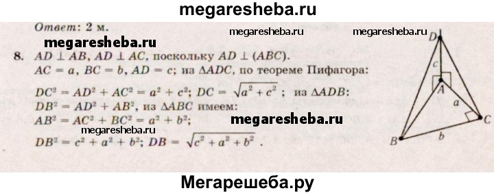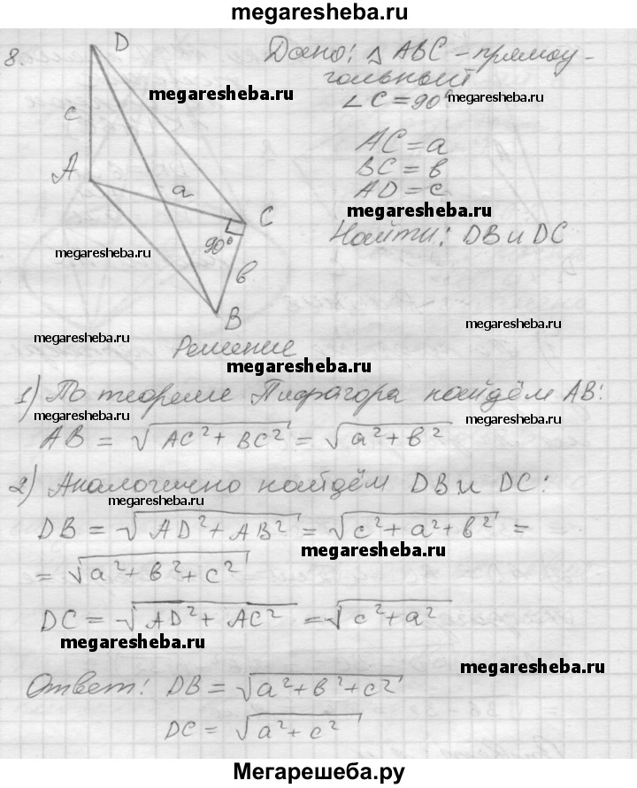 8. Через вершину острого угла прямоугольного треугольника ABC с прямым углом С проведена прямая AD, перпендикулярная плоскости треугольника. Найдите расстояния от точки D до вершин В и С, если АС = а, ВС = b, AD = с.