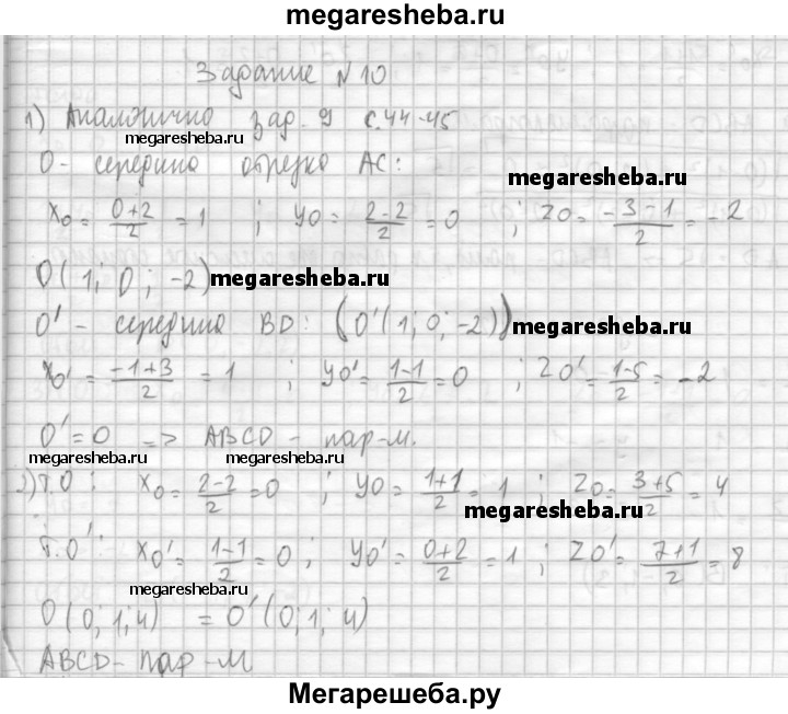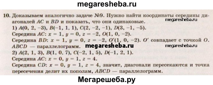 10. Докажите, что четырехугольник ABCD является параллелограммом, если: 1) А (0; 2; -3), В (-1; 1; 1), С (2; -2; -1), D (3; -1; -5); 2) А (2; 1; 3), В (1; 0; 7), С (-2; 1; 5), D (-1; 2; 1).