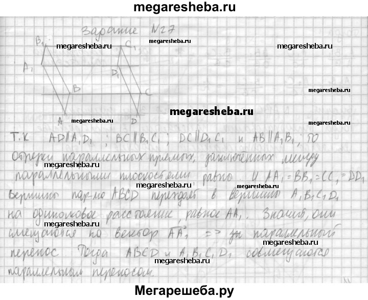 27. Четыре параллельные прямые пересекают параллельные плоскости в вершинах параллелограммов ABCD и A1B1C1D1 соответственно. Докажите, что параллелограммы ABCD и AlB1C1D1 совмещаются параллельным переносом.