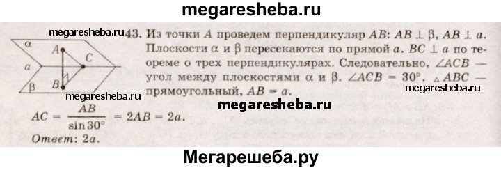 43. Две плоскости пересекаются под углом 30°. Точка А, лежащая в одной из этих плоскостей, отстоит от другой плоскости на расстояние а. Найдите расстояние от этой точки до прямой пересечения плоскостей.