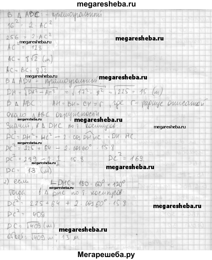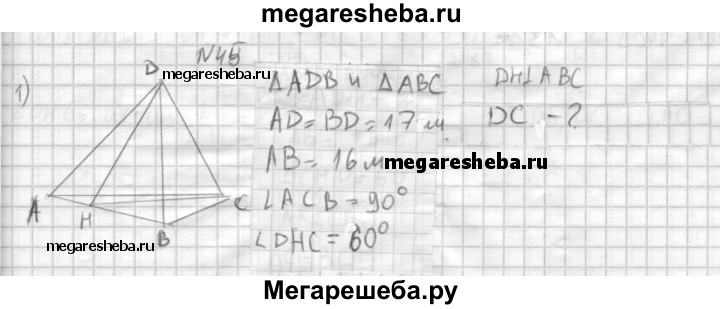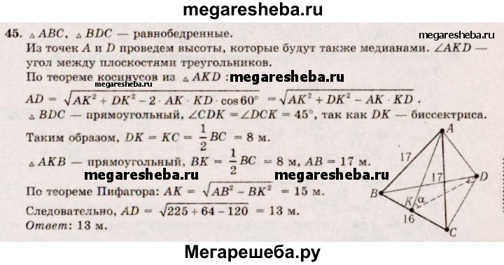 45. Два равнобедренных треугольника имеют общее основание, а их плоскости образуют угол 60°. Общее основание равно 16 м, боковая сторона одного треугольника 17 м, а боковые стороны другого перпендикулярны. Найдите расстояние между вершинами треугольников.