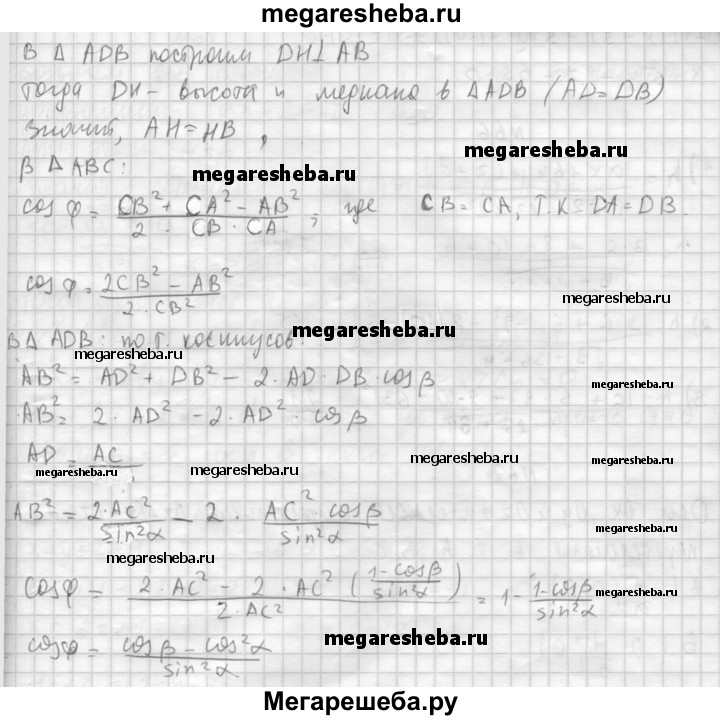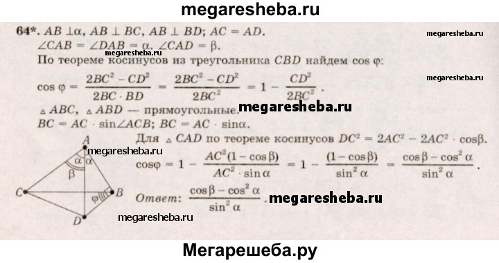 64. Из точки вне плоскости проведены перпендикуляр и две равные наклонные, образующие углы а с перпендикуляром. Найдите угол ф между проекциями наклонных, если угол между наклонными β.