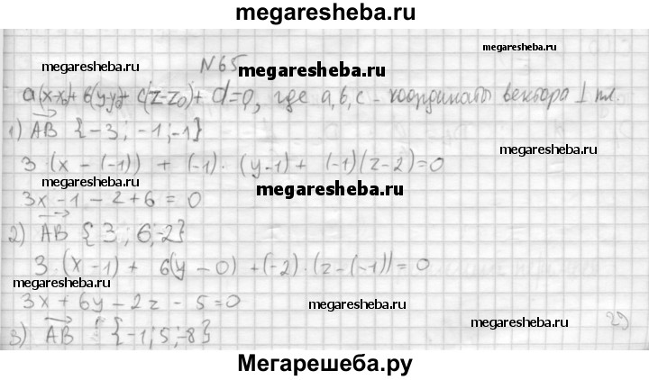 65. Составьте уравнение плоскости, которая проходит через точку А и перпендикулярна прямой АВ, если: 1) А(-1; 1; 2), В(2; 0; 1); 2) А(1; 0; -1), В(4; 6; -3); 3) А(3; -4; 5), В(2; 1; -3).