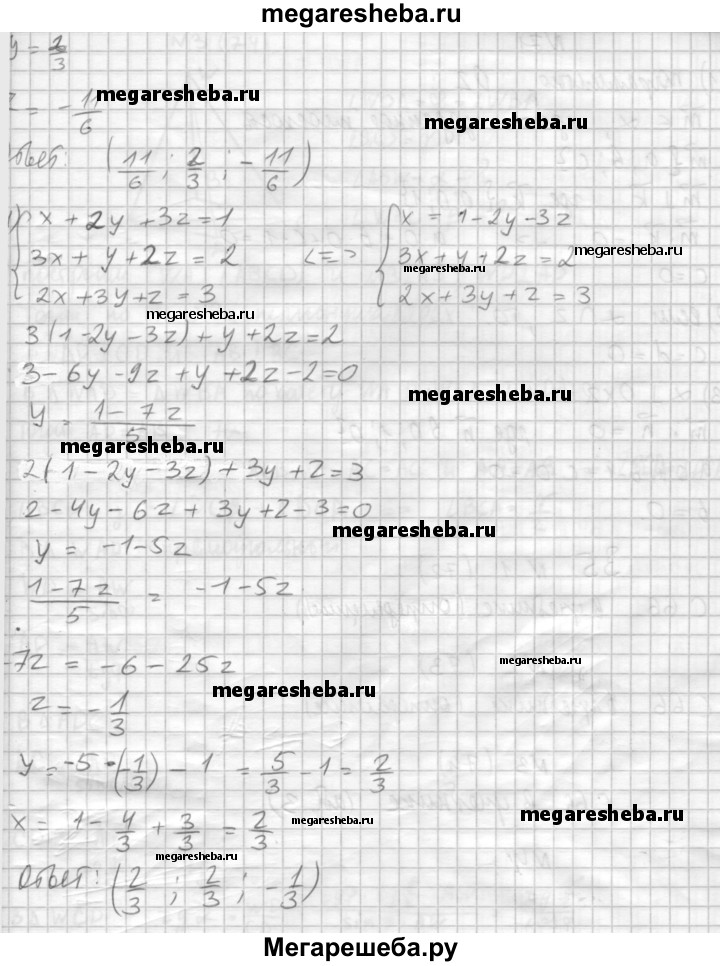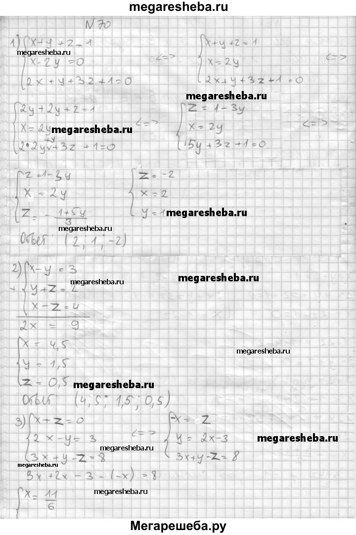 70. Найдите точку пересечения трех плоскостей, задаваемых уравнениями: 1) х + у + z = 1, x - 2у = 0, 2х + у + 3z + 1 = 0; 2) х - у = 3, у + z = 2, х - z = 4; 3) х + z = 0, 2х - у = 3, Зх + у - z = 8; 4) х + 2у + 3z = 1, Зх + у + 2z = 2, 2х + Зу + z = 3.