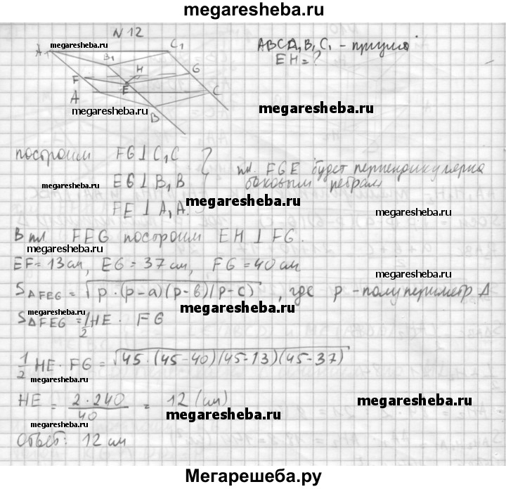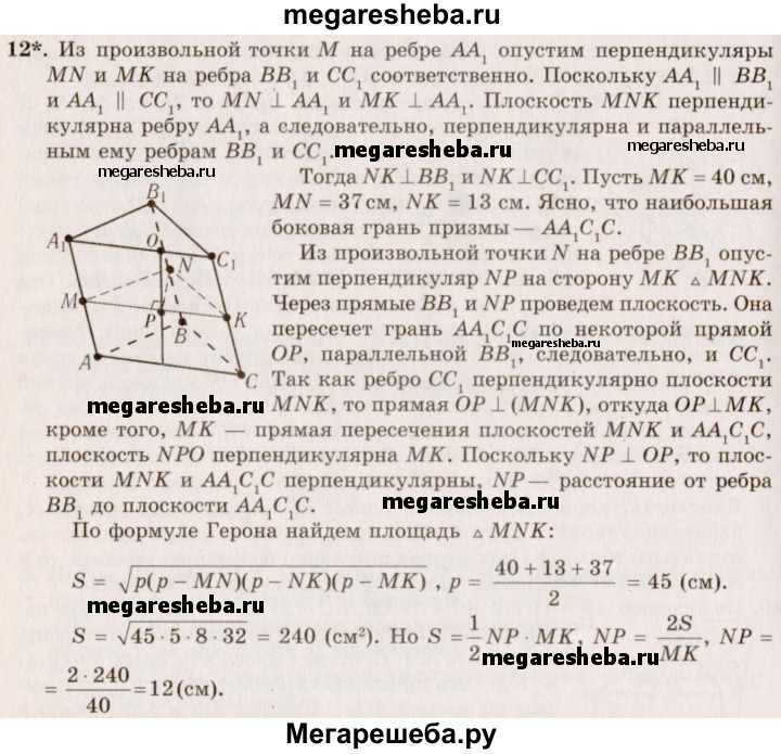 12. В наклонной треугольной призме расстояния между боковыми ребрами равны 37 см, 13 см и 40 см. Найдите расстояние между большей боковой гранью и противолежащим боковым ребром.