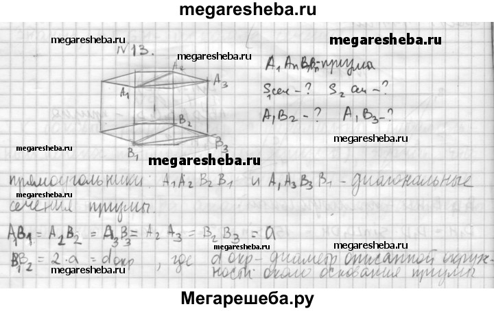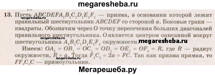 13. Основанием призмы является правильный шестиугольник со стороной а, боковые грани — квадраты. Найдите диагонали призмы и площади ее диагональных сечений.