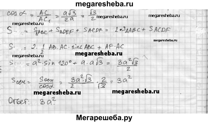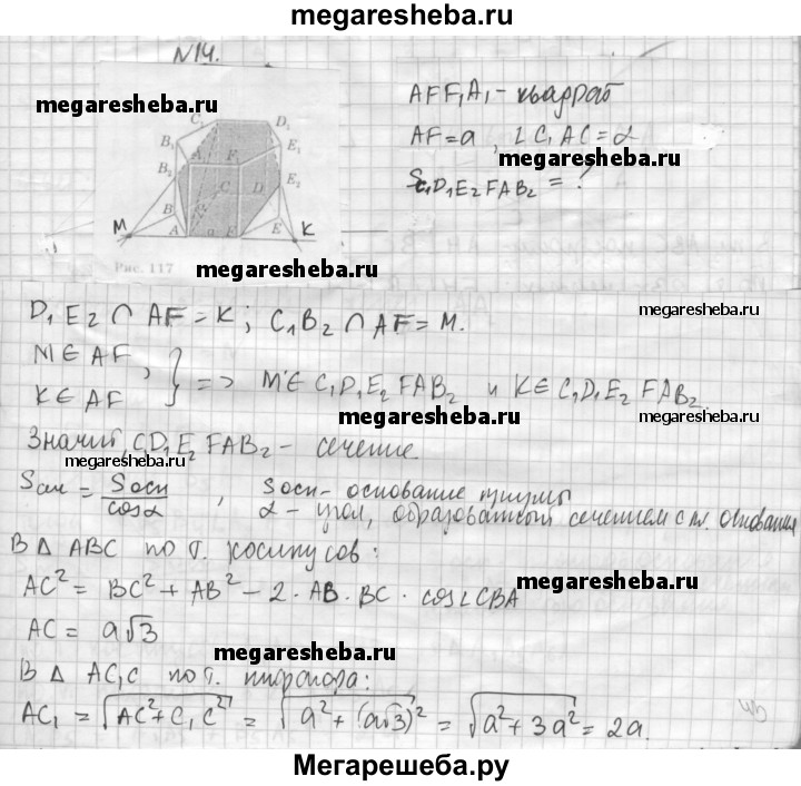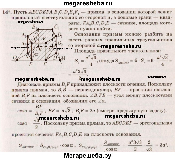 14. В правильной шестиугольной призме, у которой боковые грани — квадраты, проведите плоскость через сторону нижнего основания и противолежащую ей сторону верхнего основания. Сторона основания равна а. Найдите площадь построенного сечения.