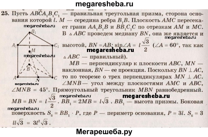 25. Плоскость, проходящая через сторону основания правильной треугольной призмы и середину противолежащего ребра, образует с основанием угол 45°. Сторона основания I. Найдите боковую поверхность призмы.