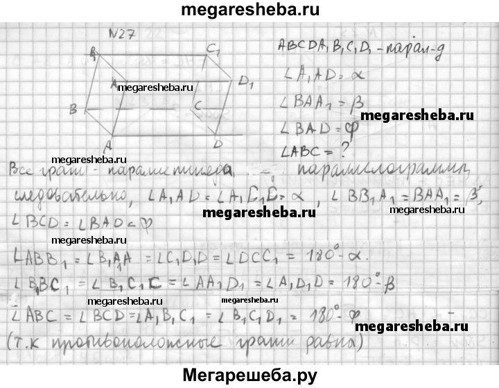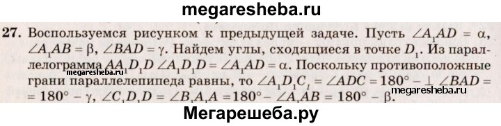 27. Известны углы, образуемые ребрами параллелепипеда, сходящимися в одной вершине. Как найти углы между ребрами, сходящимися в любой другой вершине?