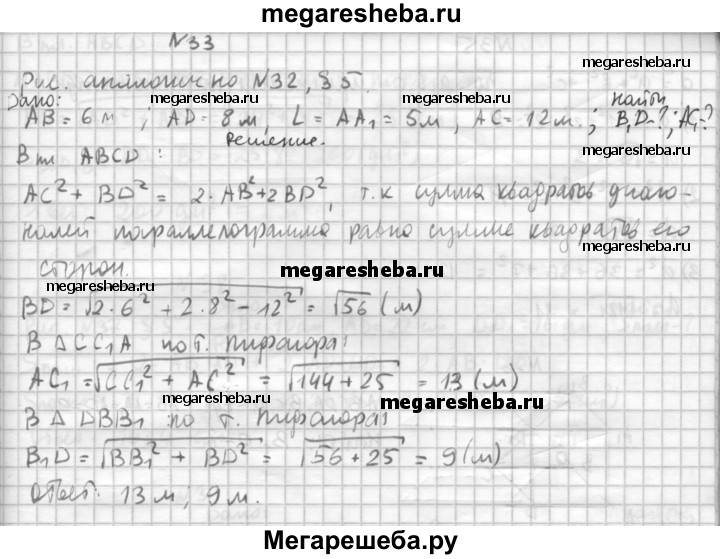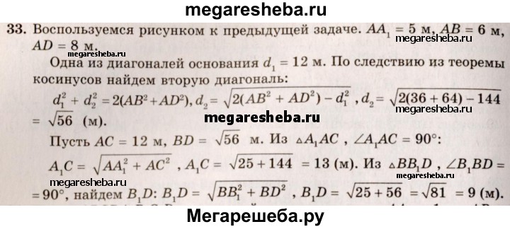 33. Боковое ребро прямого параллелепипеда 5 м, стороны основания 6 м и 8 м, а одна из диагоналей основания 12 м. Найдите диагонали параллелепипеда.