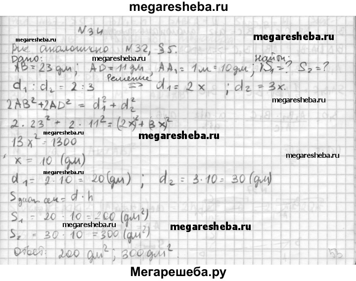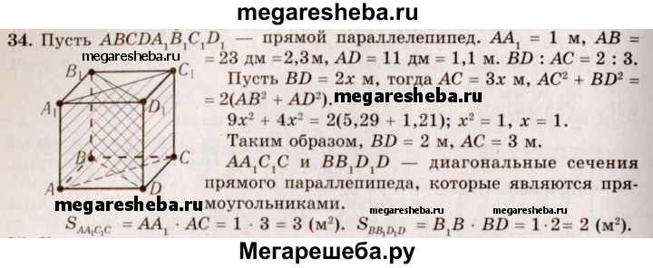 34. В прямом параллелепипеде боковое ребро 1 м, стороны основания 23 дм и 11 дм, а диагонали основания относятся как 2 : 3. Найдите площади диагональных сечений.