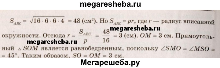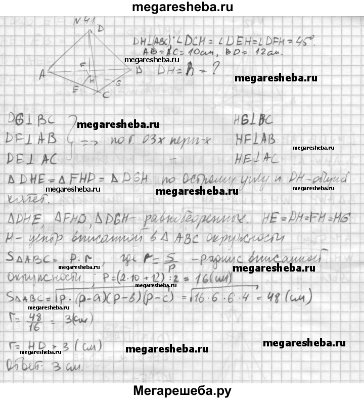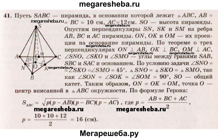41. Основание пирамиды — равнобедренный треугольник, у которого основание равно 12 см, а боковая сторона 10 см. Боковые грани образуют с основанием равные двугранные углы, содержащие по 45°. Найдите высоту пирамиды.