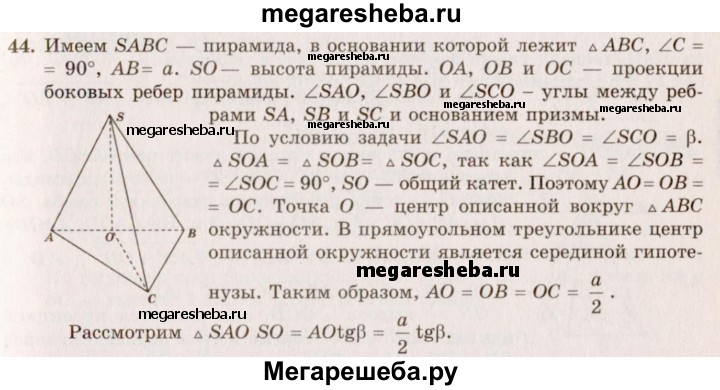 44. В основании пирамиды лежит прямоугольный треугольник с гипотенузой а. Каждое боковое ребро образует с плоскостью основания угол р. Найдите высоту пирамиды.