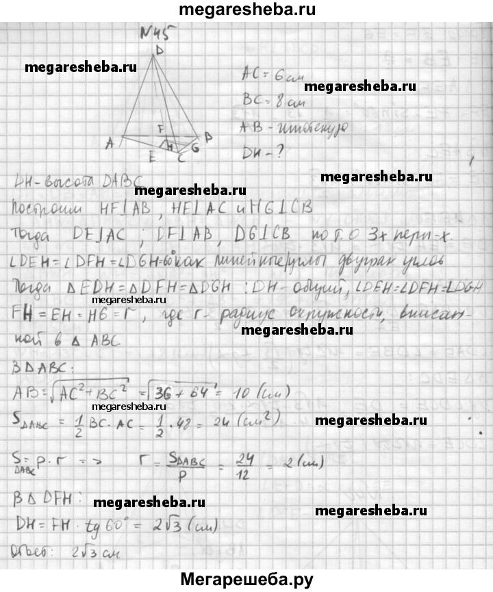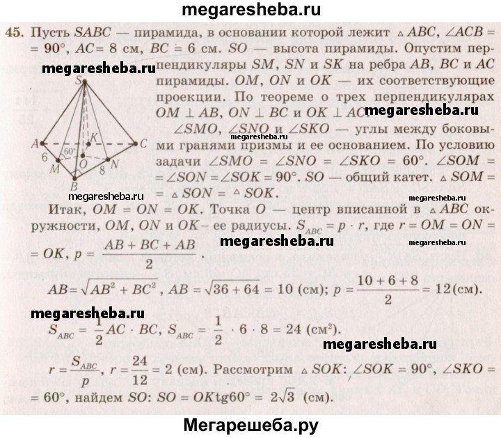 45. Основание пирамиды — прямоугольный треугольник с катетами 6 см и 8 см. Все двугранные углы при основании пирамиды равны 60°. Найдите высоту пирамиды.