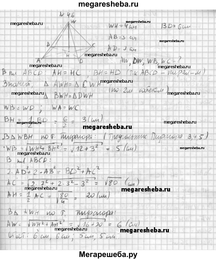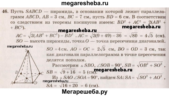 46. Основание пирамиды — параллелограмм, у которого стороны 3 см и 7 см, а одна из диагоналей 6 см; высота пирамиды проходит через точку пересечения диагоналей, она равна 4 см. Найдите боковое ребро пирамиды.