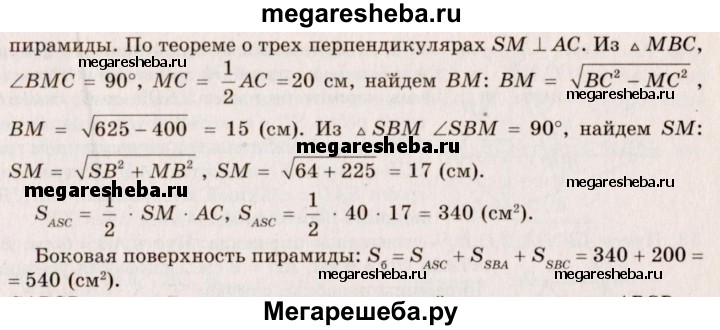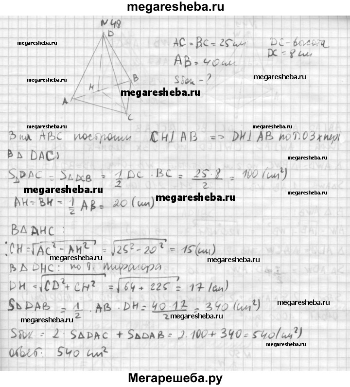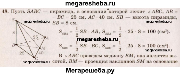 48. Основание пирамиды — равнобедренный треугольник со сторонами 40 см, 25 см и 25 см. Ее высота проходит через вершину угла, противолежащего стороне 40 см, и равна 8 см. Найдите боковую поверхность пирамиды.
