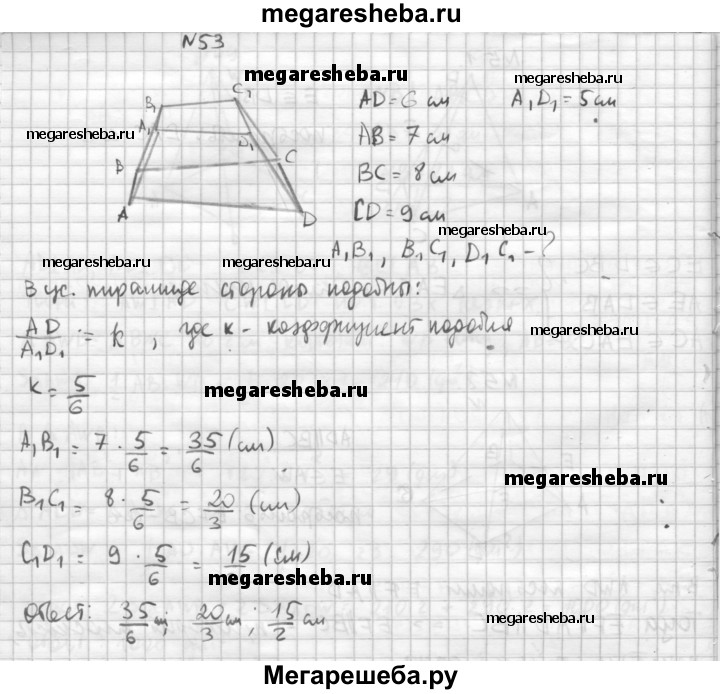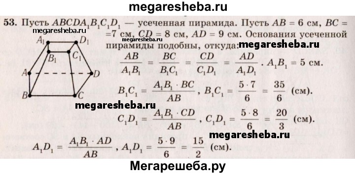 53. У четырехугольной усеченной пирамиды стороны одного основания равны 6 см, 7 см, 8 см, 9 см, а меньшая сторона другого основания равна 5 см. Найдите остальные стороны этого основания.