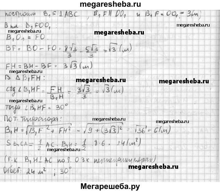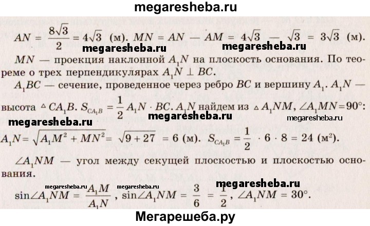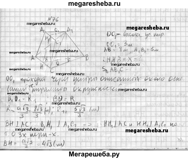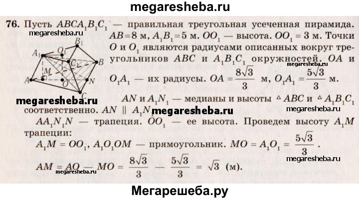 76. В правильной треугольной усеченной пирамиде сторона нижнего основания 8 м, верхнего — 5 м, а высота 3 м. Проведите сечение через сторону нижнего основания и противоположную вершину верхнего основания. Найдите площадь сечения и двугранный угол между сечением и нижним основанием.