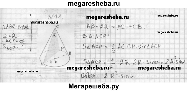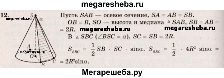 12. В равностороннем конусе (в осевом сечении правильный треугольник) радиус основания R. Найдите площадь сечения, проведенного через две образующие, угол между которыми равен а.