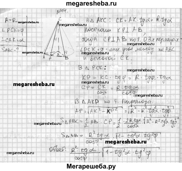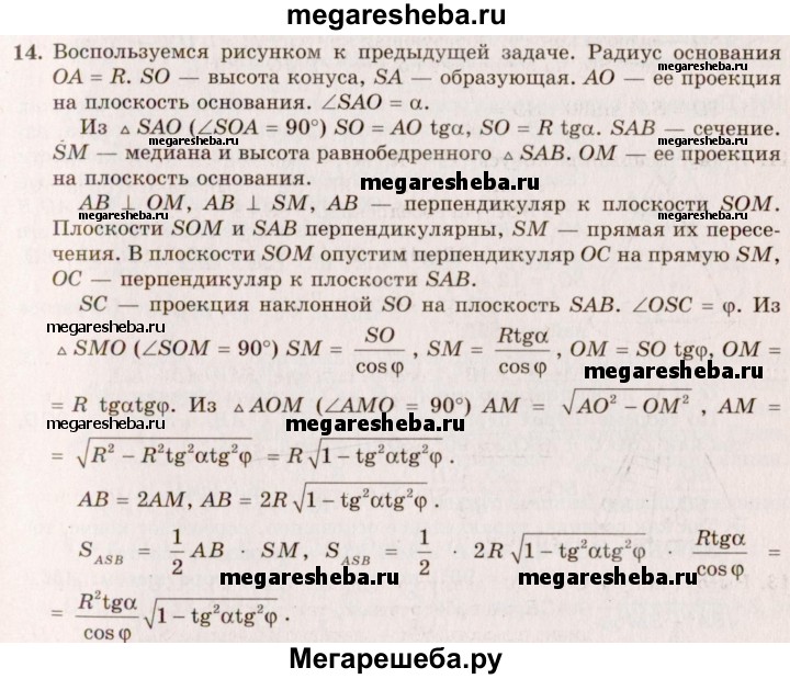 14. Радиус основания конуса R, а образующая наклонена к плоскости основания под углом а. Через вершину конуса проведена плоскость под углом ф к его высоте. Найдите площадь полученного сечения.