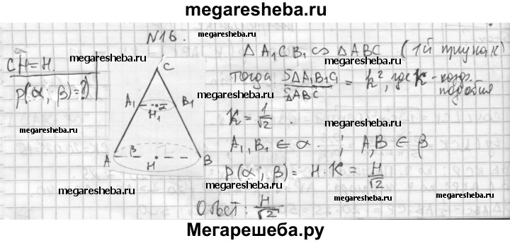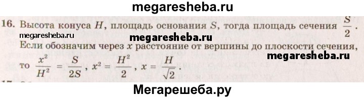 16. Высота конуса Н. На каком расстоянии от вершины надо провести плоскость, параллельную основанию, чтобы площадь сечения была равна половине площади основания?
