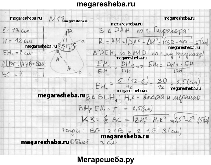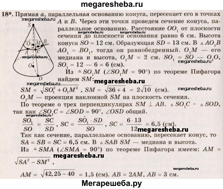 18. Образующая конуса 13 см, высота 12 см. Конус пересечен прямой, параллельной основанию; расстояние от нее до основания равно 6 см, а до высоты — 2 см. Найдите отрезок прямой, заключенный внутри конуса.