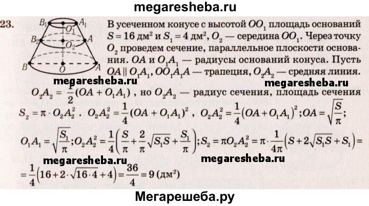 23. Площади оснований усеченного конуса 4дм2 и 16 дм2. Через середину высоты проведена плоскость, параллельная основаниям. Найдите площадь сечения.