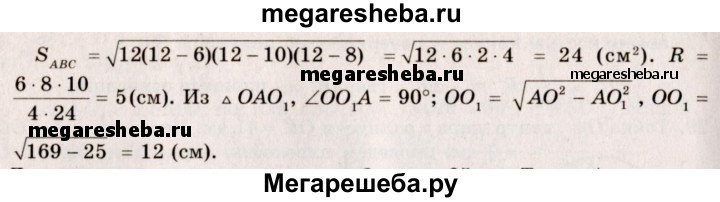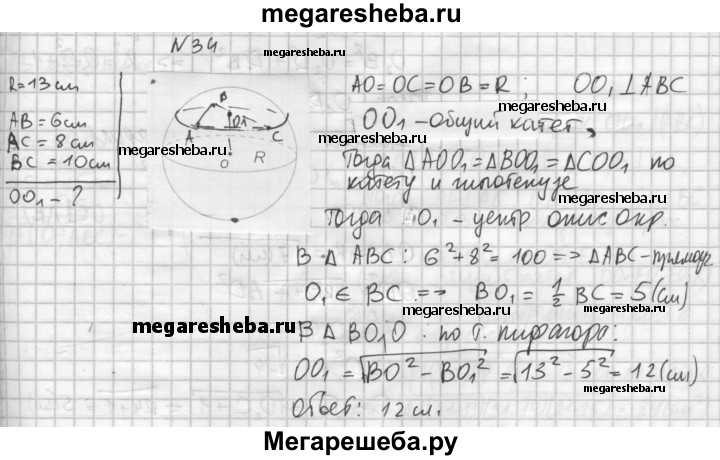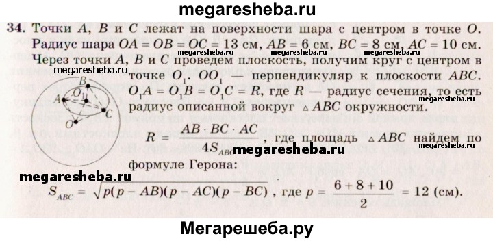 34. На поверхности шара даны три точки. Прямолинейные расстояния между ними 6 см, 8 см, 10 см. Радиус шара 13 см. Найдите расстояние от центра до плоскости, проходящей через эти точки.