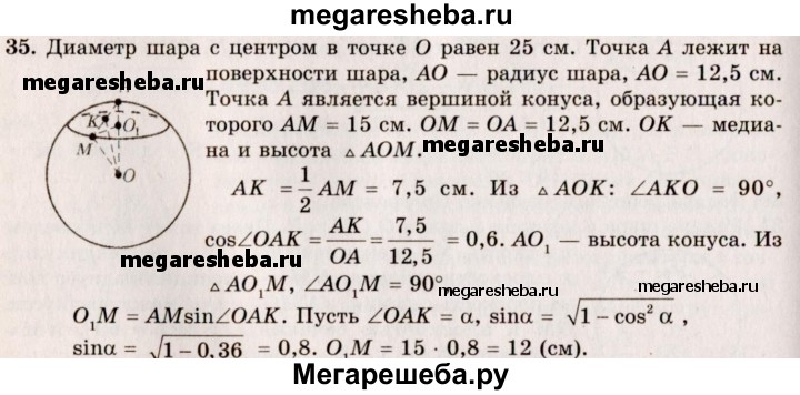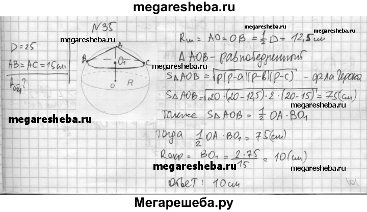 35. Диаметр шара 25 см. На его поверхности даны точка А и окружность, все точки которой удалены (по прямой) от А на 15 см. Найдите радиус этой окружности.