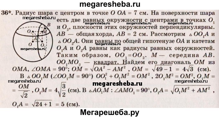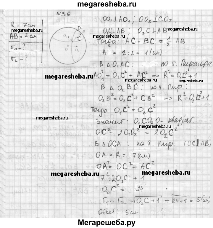 36. Радиус шара 7 см. На его поверхности даны две равные окружности, имеющие общую хорду длиной 2 см. Найдите радиусы окружностей, зная, что их плоскости перпендикулярны.