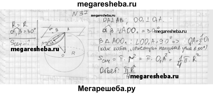 37. Дан шар радиуса R. Через одну точку его поверхности проведены две плоскости: первая — касательная к шару, вторая — под углом 30° к первой. Найдите площадь сечения.