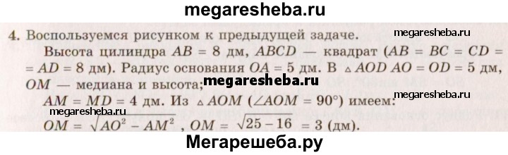 4. Высота цилиндра 8 дм, радиус основания 5 дм. Цилиндр пересечен плоскостью так, что в сечении получился квадрат. Найдите расстояние от этого сечения до оси.