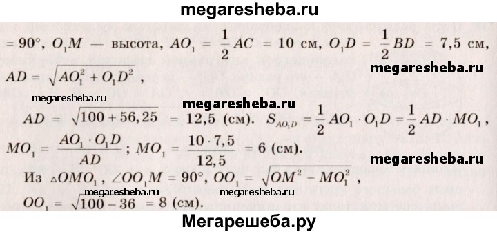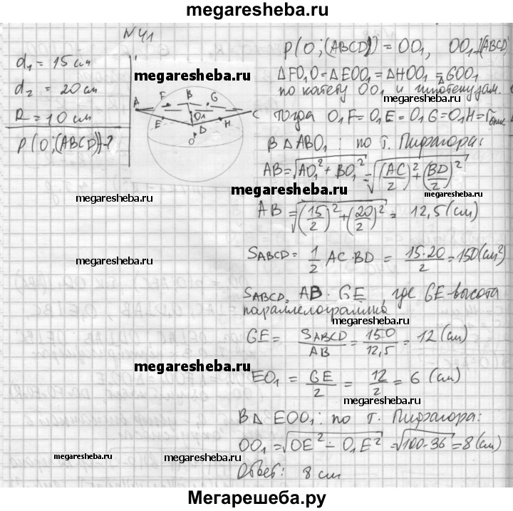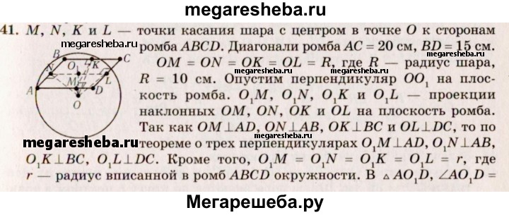 41. Диагонали ромба 15 см и 20 см. Шаровая поверхность касается всех его сторон. Радиус шара 10 см. Найдите расстояние от центра шара до плоскости ромба.