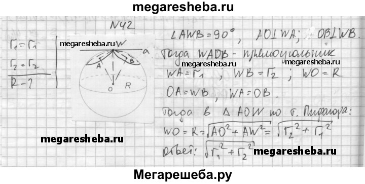 42. Через касательную к поверхности шара проведены две взаимно перпендикулярные плоскости, пересекающие шар по кругам радиусов и г2. Найдите радиус шара R.