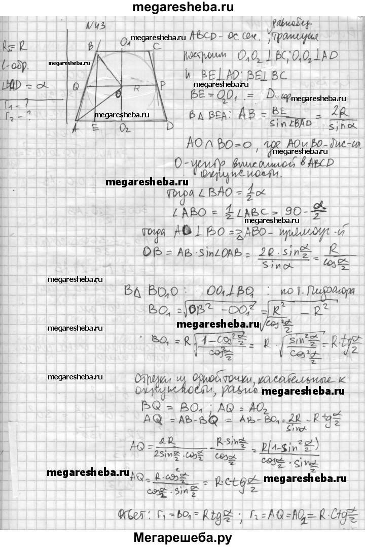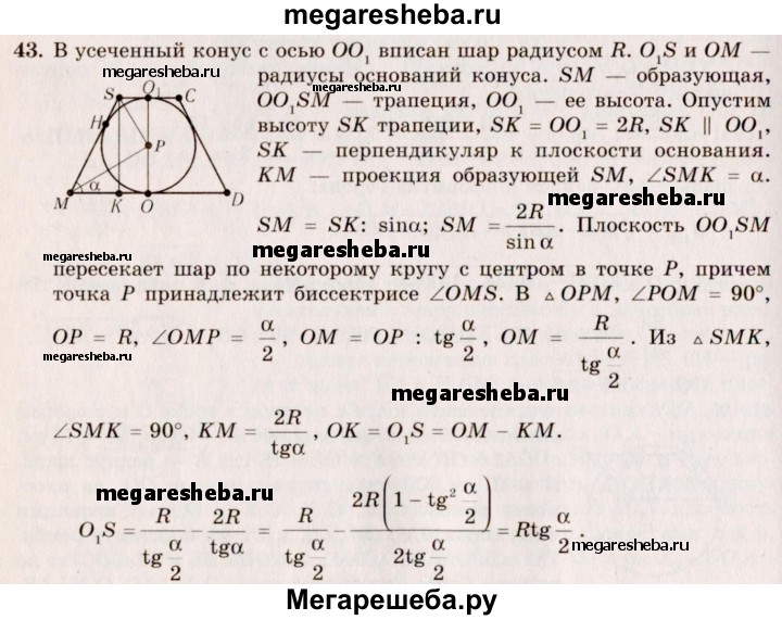43. Шар радиуса R вписан в усеченный конус. Угол наклона образующей к плоскости нижнего основания конуса равен а. Найдите радиусы оснований и образующую усеченного конуса.