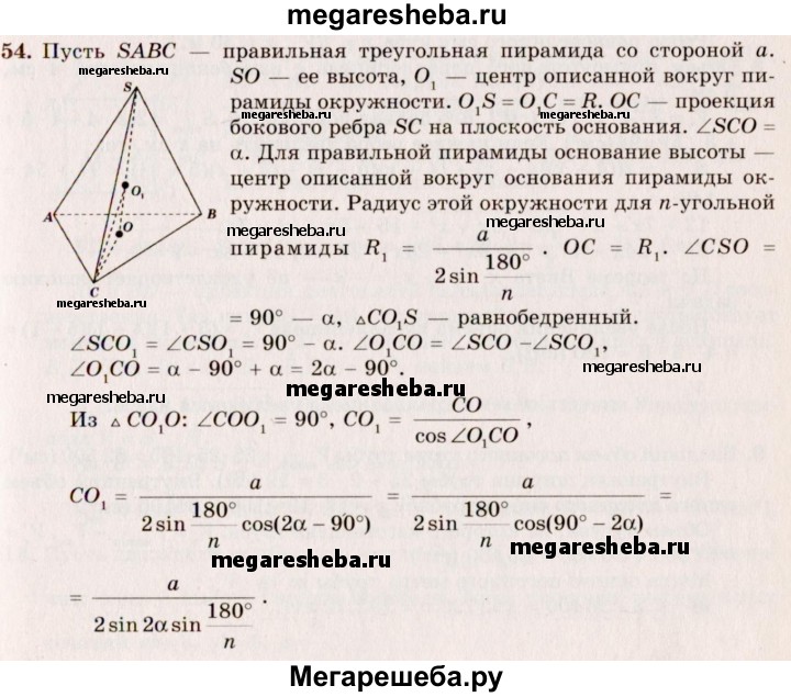 54. Найдите радиус шара, описанного около правильной n-угольной пирамиды, если сторона основания равна а, а боковое ребро наклонено к плоскости основания под углом α.