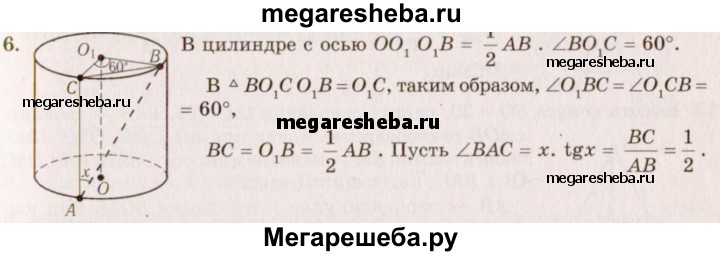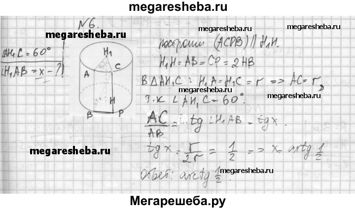 6. В равностороннем цилиндре (диаметр равен высоте цилиндра) точка окружности верхнего основания соединена с точкой окружности нижнего основания. Угол между радиусами, проведенными в эти точки, равен 60°. Найдите угол х между проведенной прямой и осью цилиндра.