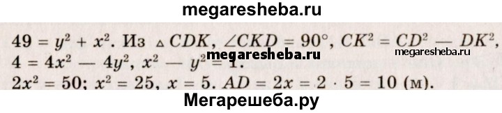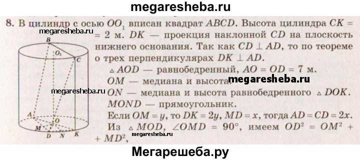 8. Высота цилиндра 2 м. Радиус оснований 7 м. В этот цилиндр наклонно вписан квадрат так, что все вершины его лежат на окружностях оснований. Найдите сторону квадрата.