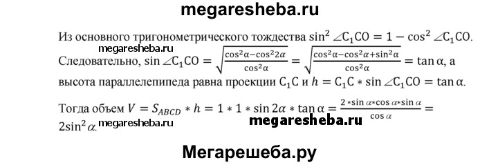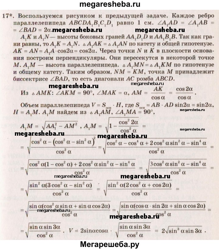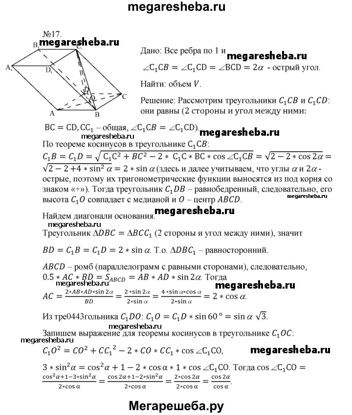 17. Каждое ребро параллелепипеда равно 1 см. У одной из вершин параллелепипеда все три плоских угла острые, по 2а каждый. Найдите объем параллелепипеда.