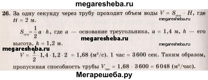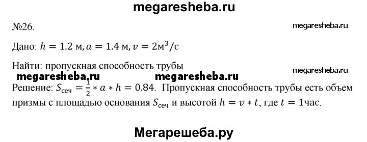 26. Вычислите пропускную способность (в кубических метрах за 1 ч) водосточной трубы, сечение которой имеет вид равнобедренного треугольника с основанием 1,4 м и высотой 1,2 м. Скорость течения 2 м/с.