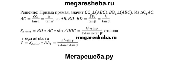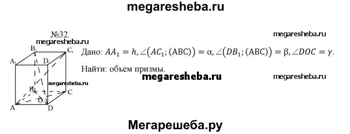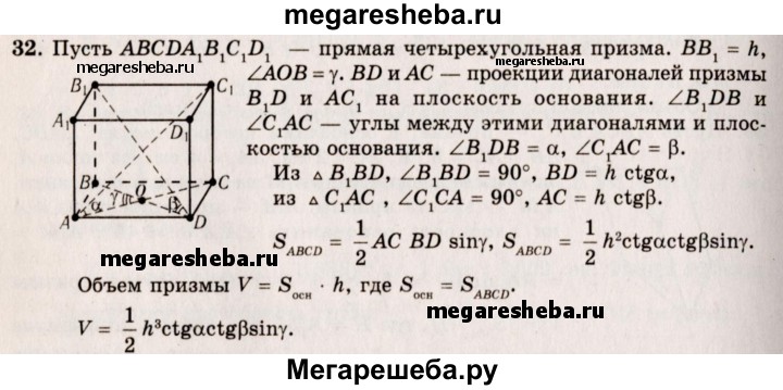32. Чему равен объем прямой четырехугольной призмы, если ее высота h, диагонали наклонены к плоскости основания под углами а и (3 и острый угол между диагоналями основания равен ϒ?